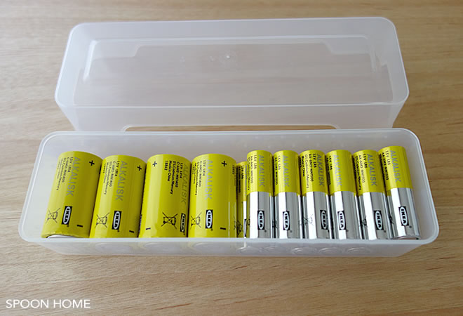 こちらの記事では、無印良品と100均一ショップ(主にセリア)を中心に乾電池の収納アイデアをご紹介しています。上の写真で掲載している乾電池は、IKEAの「ALKALISK アルカリ電池」です。