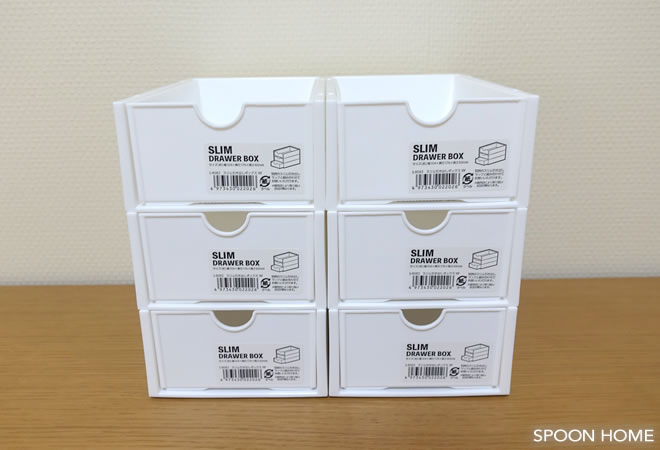 「スリム引き出しボックス・ラック」はポリプロピレン素材の収納グッズなので、洗面所でも使いやすいアイテムです。高さを抑えるため2段ずつ並べて使用しました。
