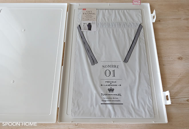 使用前のラッピング袋や包装紙は折り目がつきやすいアイテムです。ストックしているラッピング用品をまとめておくのに重宝します。