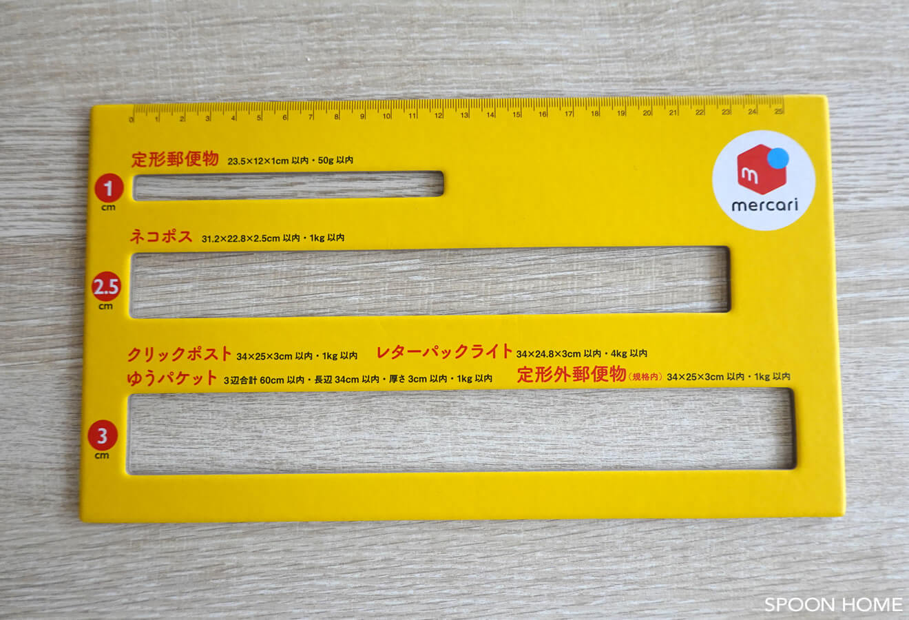 「1cm・2.5cm・3cm」の厚みを測定でき、ゆうパケットやネコポスなど発送方法の種類がわかりやすいです。