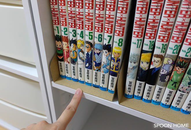 上段に収納している漫画の背表紙が見えるので、どこにどんな漫画を収納しているか確認しやすいです。100円ショップのコミックスタンドを使用することで、使いやすく漫画を収納することができました。