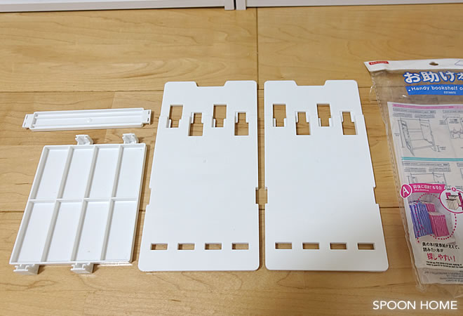 本を前後に収納するために「お助け本棚」を組み立てました。組み立て自体は簡単で1分弱で終わります。