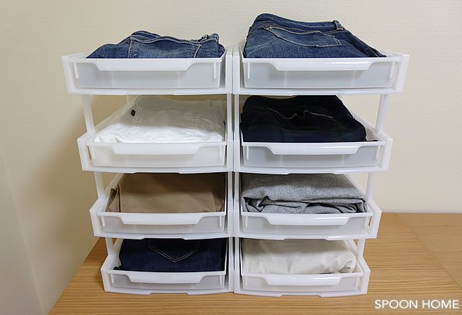 トレーを使用するとパンツを引き出しやすくなるので、2着分のパンツを収納することができました。