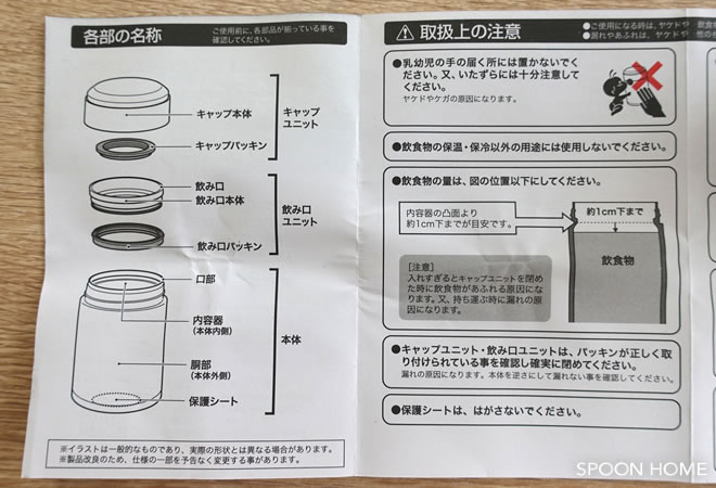 取り扱い説明書には、スープポットのお手入れ方法が記載されていました。食べた後は、可能な範囲で洗っておく(水で中を流しておく)のがおすすめです。
