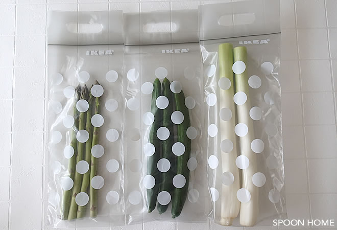 BAMSIGプラスチック袋は密封保存ができるので、細長い野菜の保存にも便利です。上の写真では、アスパラやキュウリ、白ネギを入れています。