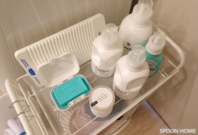 一番上のラックには洗濯洗剤ボトルや洗濯石鹸など、よく使用するランドリーグッズをまとめて置きました。