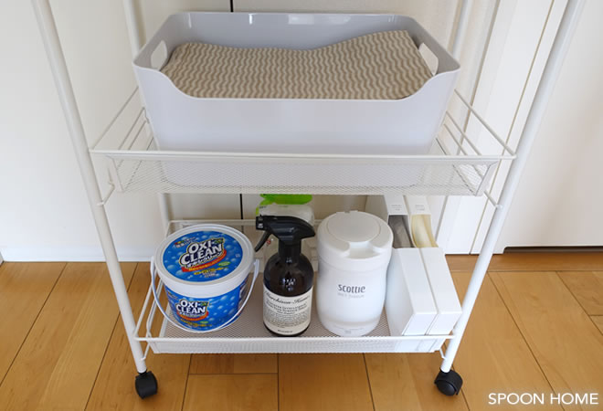 洗剤スプレーやメラミンスポンジ、ブラシなどの掃除グッズをまとめて収納しました。HORNAVANワゴンは白色(ホワイト)なので、清潔感があるのも嬉しいポイントです。