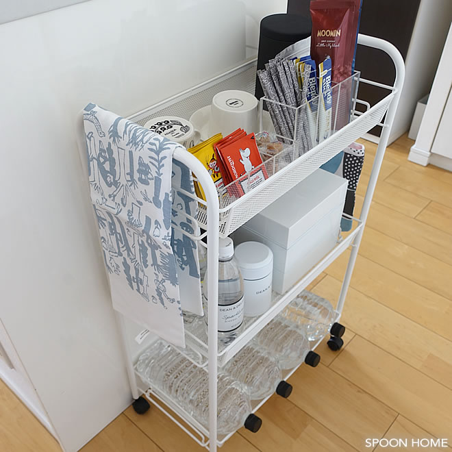イケアのワゴンは3段タイプが多く、縦のスペースをうまく活用することができます。一番上のラックは高さがある物を置きやすく、よく出し入れする物の収納に便利です。