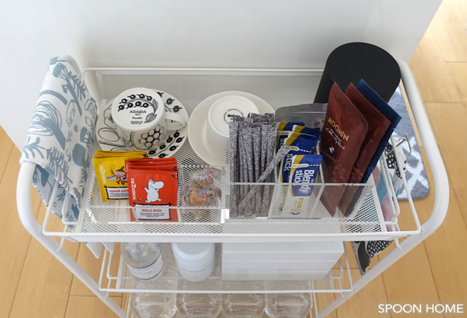 上のラックにはカップ&ソーサーとお茶セットを置きました。紅茶とコーヒーは取り出しやすいように、無印良品のアクリル収納グッズで立てて収納しています。
