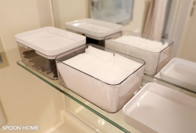 3個セットに入っている小2個をコットンと綿棒入れとして使用しました。透明グレーなので残量を確認しやすく、スッキリとした印象に。重ねて置くことができるのでスペースを節約することができます。
