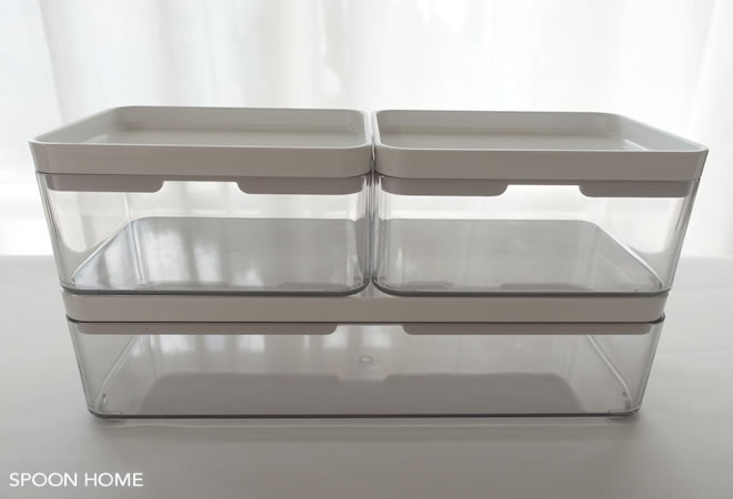 2つめは、ボックス3個が1セットになっているアイテムで、999円で販売しています。横長タイプが1個と小が2個です。大の上に小2個がキレイに収まり、セットで使用することができます。