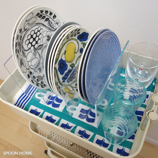 使用する機会が多い食器を一番上に置いておくと便利です。収納しておく際は、上にキッチンクロスをかぶせて埃を避けるのがおすすめ。同じ食器シリーズで揃えると統一感が出やすく、見た目もキレイに仕上げることができます。大人数で食事をする際の予備の食器置き場としても活躍します。