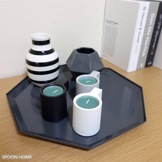 先ほどご紹介した「INFÅNGAキャンドル皿」に載せました。黒、グレー、白のティーライトホルダーは、キャンドル自体の色がキレイに映えます。