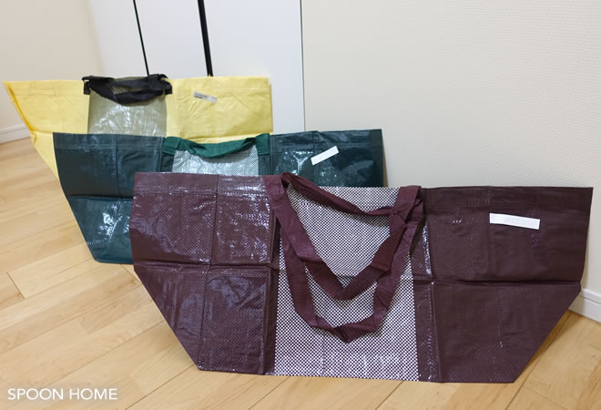 イッペルリグのショッピングバッグを並べて見ました。グリーンやイエローなど、独特の色使いが素敵なアイテムです。IKEAの店舗に行く時は必ずこのバッグを持参しています。