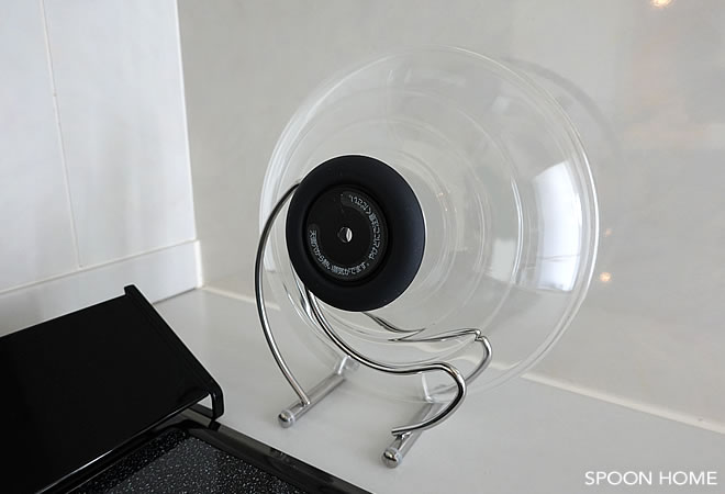鍋蓋スタンドはまな板(カッティングボード)の置き場所としても使用できます。上の写真では、栗原はるみのまな板(直径35cm)を立てて収納しています。