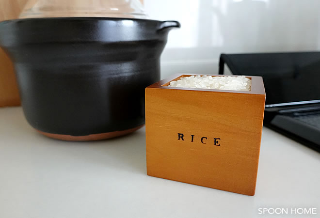 味があるRICEの文字が可愛いです。商品レビューを読むとお米をガラスジャーで保存し、そこに木製ライスジャーを入れている方が多いようでした。