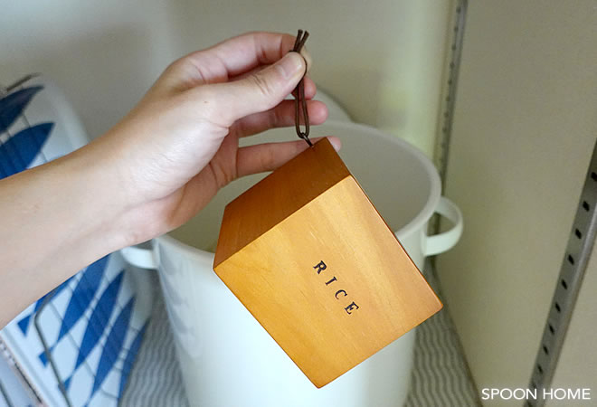 木製ライスメジャーを対角線上に傾けると、お米を0.5合計ることができました。水洗いはNGで、濡らした布巾で手入れをします。