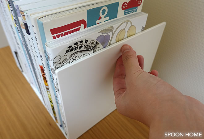 雑誌や本を立てて収納しました。ブックスタンド自体が白色なので、スッキリとした印象にまとまります。子供の絵本収納にも役立つアイテムです。