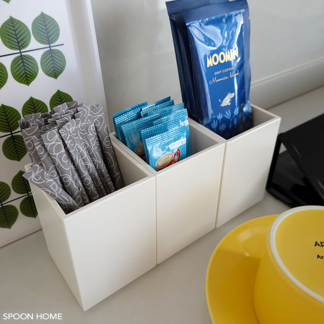 上の写真ではスティックシュガーやコーヒーを収納しました。お茶セットだけでなく、ストローや割り箸、ペーパーナプキン入れにもおすすめです。