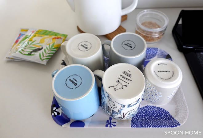 カウニステのトレイSにマグカップをまとめました。爽やかなブルーのキッチントレイは、白やライトグレーなど無地のマグカップとよく合います。