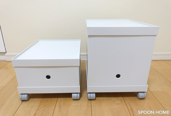 幅25cmのファイルボックスを重ねておきました。左がフタなし、右がフタありの状態です。