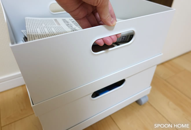 上のファイルボックスは新聞置き場として使用。キャスター付きなので移動もラクです。