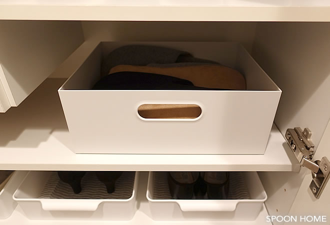 一番大きいサイズのファイルボックスを下駄箱下に並べました。外遊び道具や靴の手入れ道具入れとして重宝します。