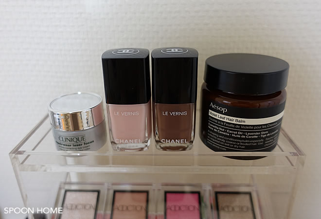 前の収納スペースには使用する機会が多いファンデーションケースやアイシャドウを入れました。