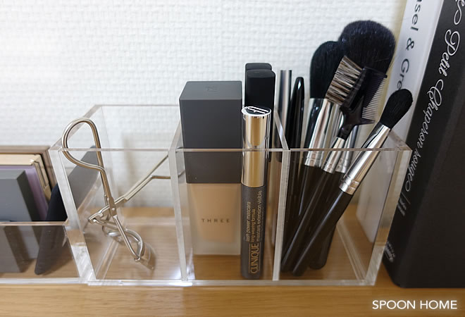 メイク道具だけでなく、細長い化粧品やヘアクリップ、メガネ置きとして重宝します。