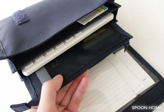 ポケットが3つに分かれているので、電卓やノートなど大きいアイテムを収納しやすいです。