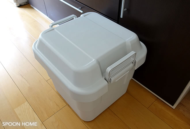 持ち運びがしやすいボックスなので、お米など食料品のストック入れとしても活躍します。上の写真では20kgのお米を収納しました。
