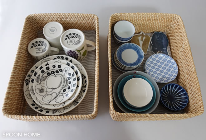 重ねて収納できるので、食器収納に役立ちます。下には「中」サイズのバスケットを置いています。