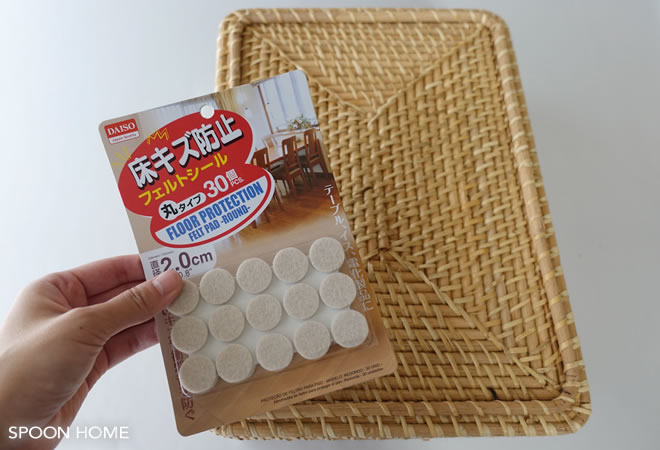 自宅では、100円ショップのダイソーで販売している「床キズ防止フェルトシート」を貼るようにしています。