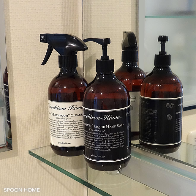 食器用洗剤や衣類用スプレーは生活感が出やすいパッケージデザインが多く、シンプルなデザインのボトル容器に移し替えて使用する場合も。元ファッション編集者のオーナーによって手がけられた「マーチソンヒューム」は、他のインテリアにも馴染みやすく、ディスプレイしたくなるアイテムです。