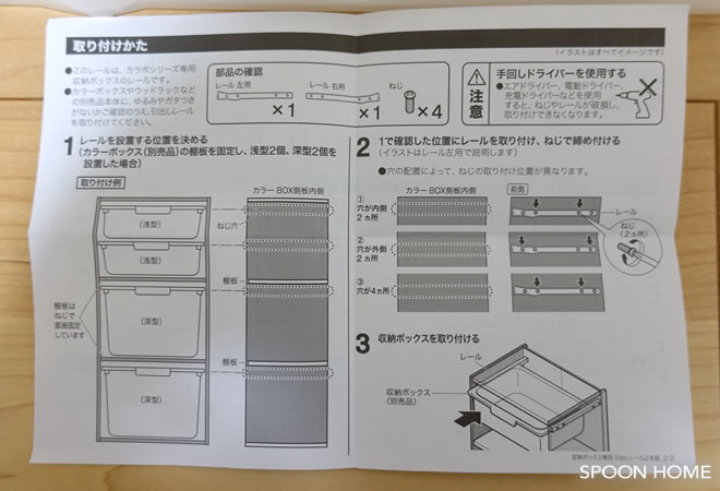 ニトリのカラーボックスは内側にダボ穴があいています。手回しのプラスドライバーを使用し、専用レールを左右同じ高さに取り付けました。
