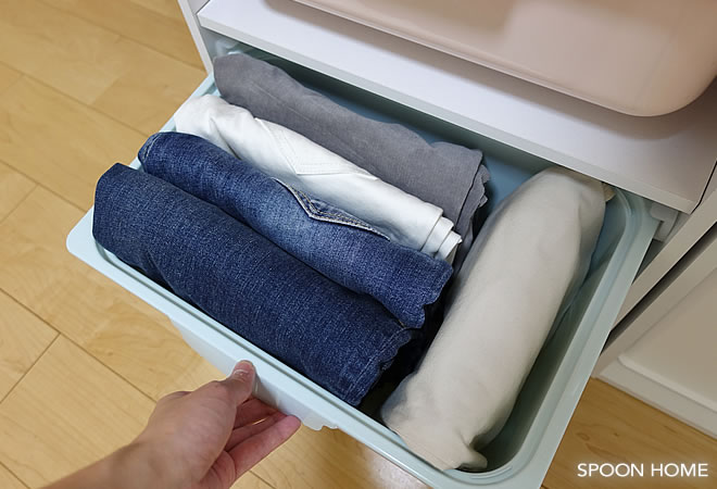シワがつきにくいデニムパンツは、深型ボックスに立てて収納することができます。引き出し式なので取り出しやすく、ズボンの散らかり防止におすすめの収納方法です。