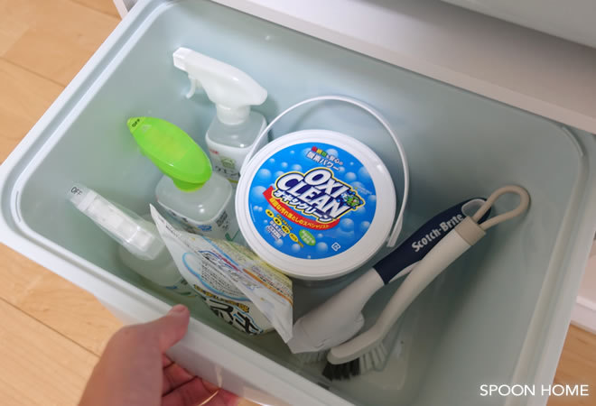 トロファスト風ボックスは素材に「ポリプロピレン」を使用しており、手入れしやすいアイテムです。ブラシや掃除グッズ、洗剤の収納にも役立ちます。
