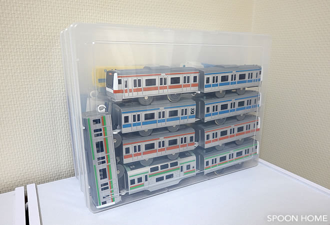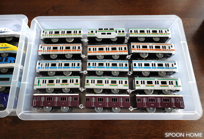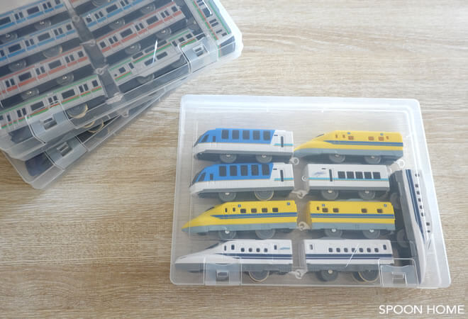 プラレールの車両は薄型のPPケース引出式に収納することができました。1つの引き出しにプラレール4台を並べることができ、引き出しの出し入れもスムーズです。