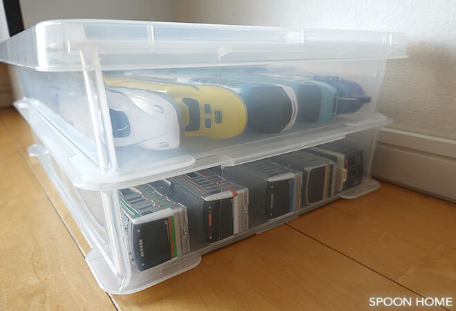 車両を2段に重ねると最大で6台まで収納可能。透明で中身が見えるボックスなので、どんな車両を収納しているか一目で分かります。