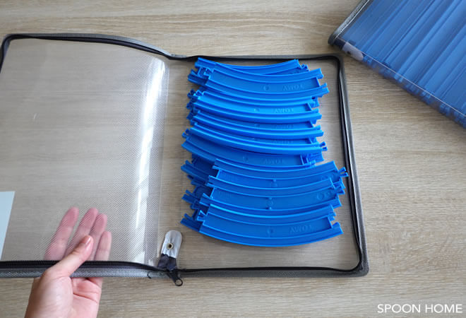 もう一つのスペースには塗り絵や本を収納することができます。少量のレールを持ち歩く場合は、ジッパー袋に入れておくと便利です。