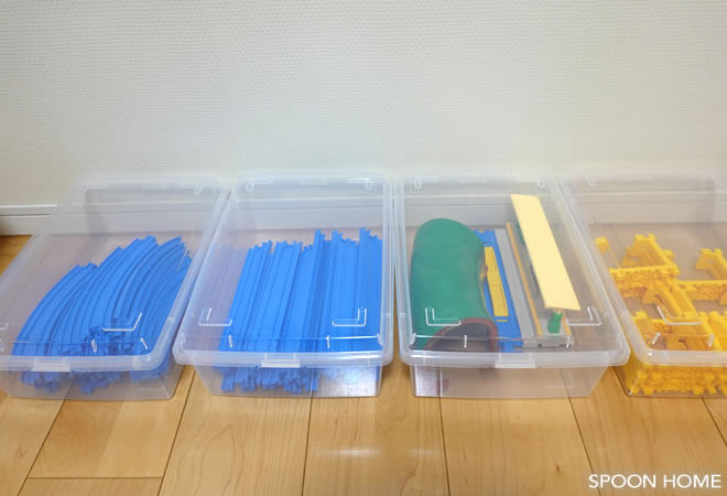 プラレールはレールやパーツの種類が多いので、ボックスを活用することで使いやすく収納することができます。「ポリプロピレンメイクボックス・1/2」は2個重ねることができました。