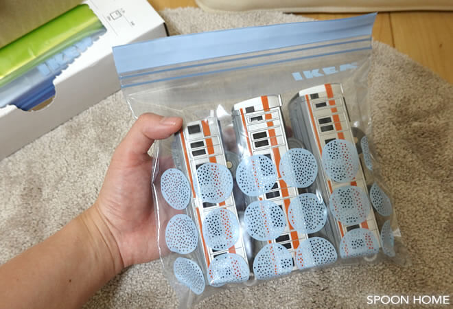 レールの持ち運びや分類収納に便利なのが、IKEAで販売している「ISTAD フリーザーバッグ」です。プラレール収納では「50ピース」と「30ピース」のフリーザーバッグを使用しました。