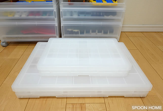 大サイズの上に小サイズを2個並べています。駅や細かいパーツの収納に便利です。