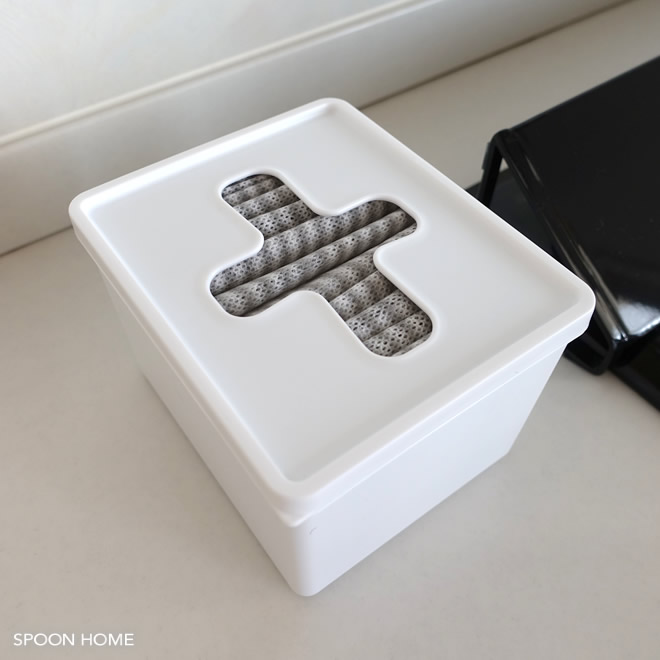 食品保存袋や水切りネットなど、取り出す機会が多い物の収納に役立ちます。白色のシンプルなボックスなので、消耗品の目隠しとしてもおすすめです。