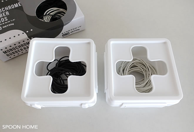ミニサイズは輪ゴムの収納におすすめです。上の写真では、セリアで販売しているモノクロームゴムバンドを収納しています。