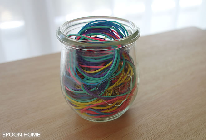 100円均一ショップでは、上の写真のようにおしゃれな輪ゴムを販売しており、見せる収納にも役立ちます。