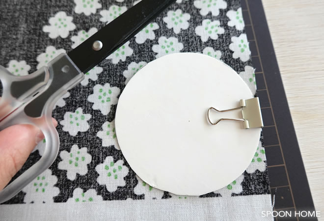 布や紙のデザインによって、切り抜きたい場所が変わります。缶バッジ本体を合わせてみて、大体の位置を決めました。