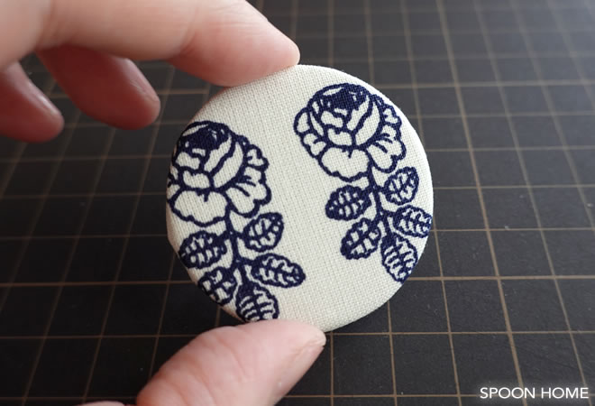 くるみボタンのような仕上がりになりました。組み合わせている無地の生地を変えるだけで、大きく印象が変わります。