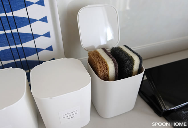 キッチンスポンジのストック収納に使用できれば…と思ったのですが、ダスキンのモノトーン・キッチンスポンジはうまく収納することができませんでした。