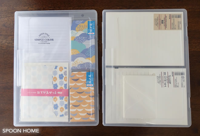 無印良品で販売しているA5サイズのレターセットと便箋を一緒に収納しました。A4サイズのファイルケースなので、A5サイズの便箋は横並びに収納することができます。